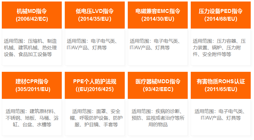CE认证范围广泛,是产品出口欧盟的通行证,其常见指令包含但不限于以下内容。